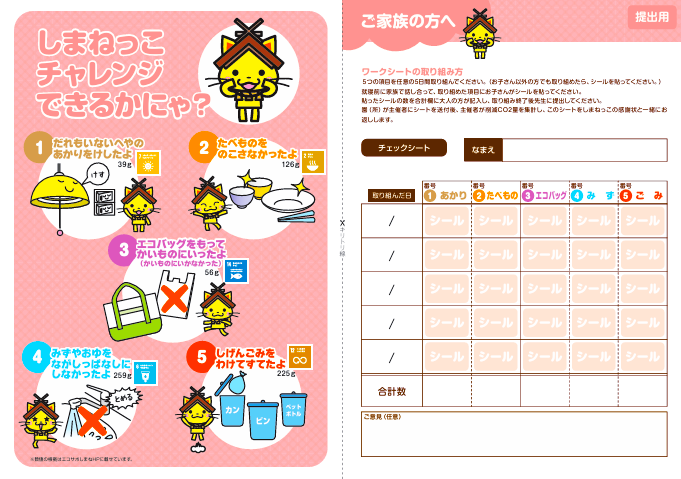 幼保園での「親子で学ぼうミニエコ講座」やしまねっこチャレンジシートの支援をしています。