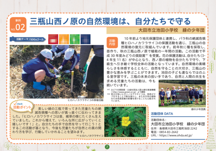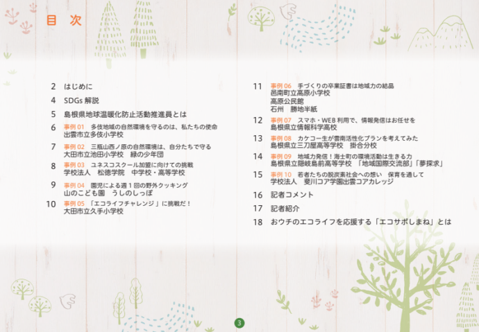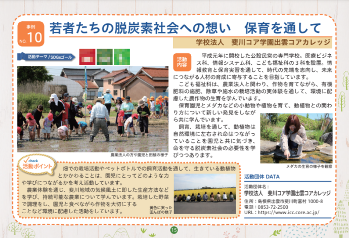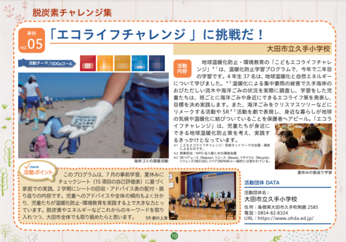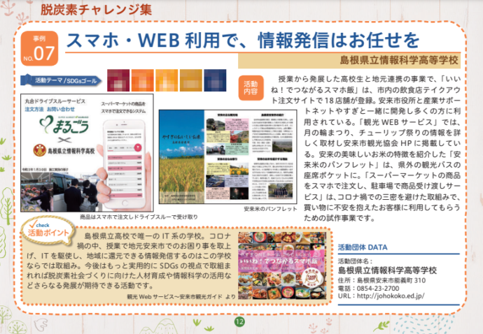 HOME > エコグッズ > しまね脱炭素チャレンジ集~学生編2~(令和2年度発行) 貸出機材詳細 提供冊子 品名 しまね脱炭素チャレンジ集~学生編2~(令和2年度発行) 概要 未来の島根を担う県内の児童・生徒・学生が取り組む地域活動をSDGsやゼロカーボンの視点から紹介しています。全10事例紹介。内容はHP「チラシ・パンフレット」 から見ることができます。 個数 小冊子/縦15㎝×横21㎝/約18ページ ギャラリー