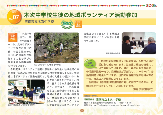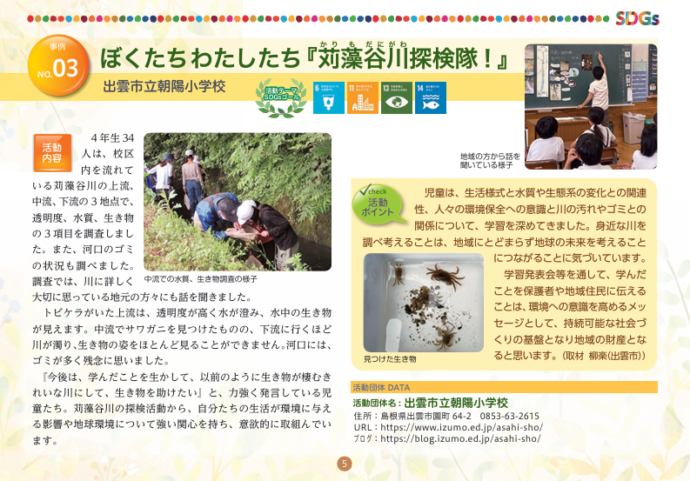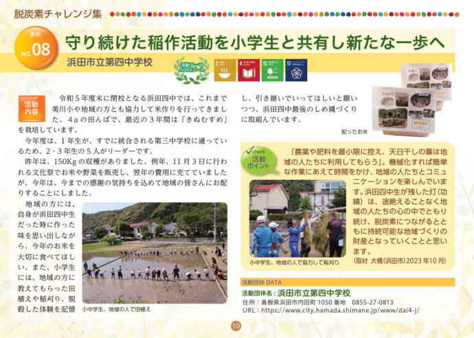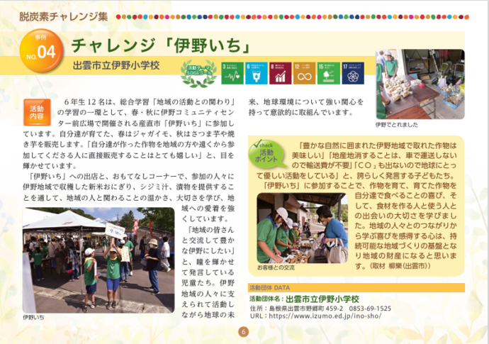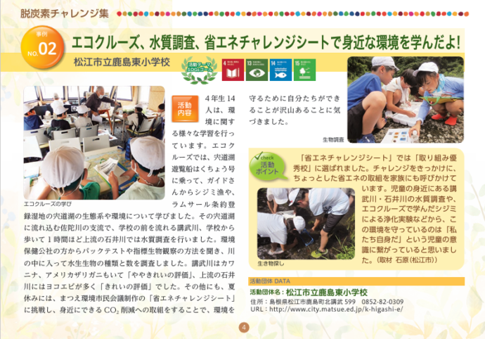 HOME > エコグッズ > しまね脱炭素チャレンジ集~学生編5~(令和5年度発行) 貸出機材詳細 提供冊子 品名 しまね脱炭素チャレンジ集~学生編5~(令和5年度発行) 概要 未来の島根を担う県内の児童・生徒・学生が取り組む地域活動をSDGsやゼロカーボンの視点から紹介しています。全11事例紹介。内容はHP「チラシ・パンフレット」 から見ることができます。 個数 小冊子/縦15㎝×横21㎝/約15ページ ギャラリー
