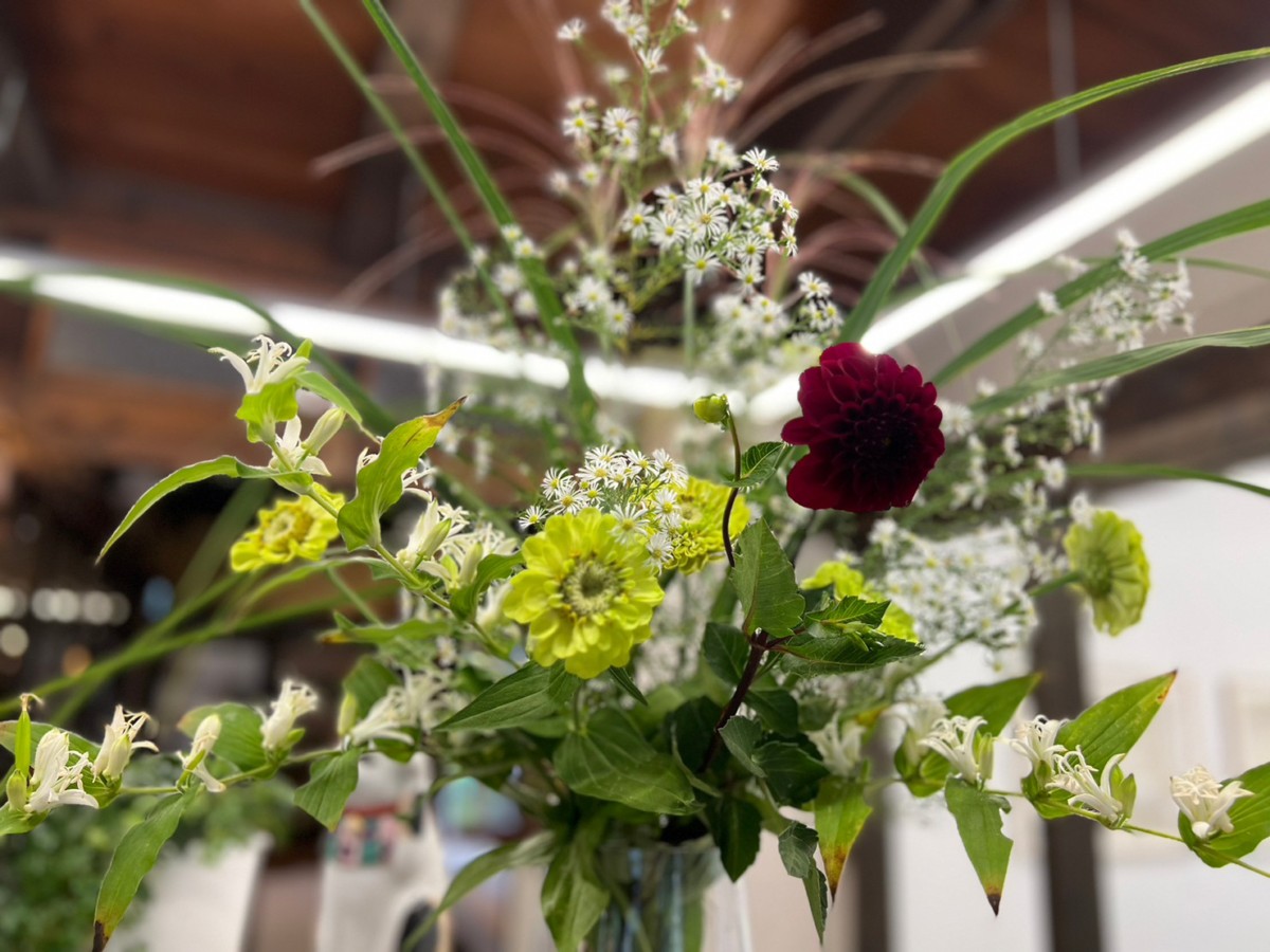 カフェの花は私やスタッフが生けていますが、廊下の花は「お手伝いしましょう」と、近隣の方が生けた花を花器ごと持ってきてくださるんです。
