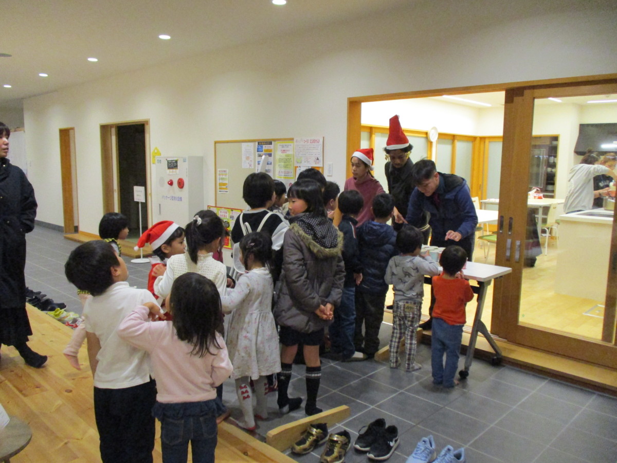 12月のクリスマス会では、アメリカから西ノ島に来た教育委員会の方がALTの先生と協力して『エッグノック』という、欧米ではクリスマスによく飲まれる、カスタードプリンを飲み物にしたものを振舞ってくださったり、指人形劇を英語でやってくださいました。