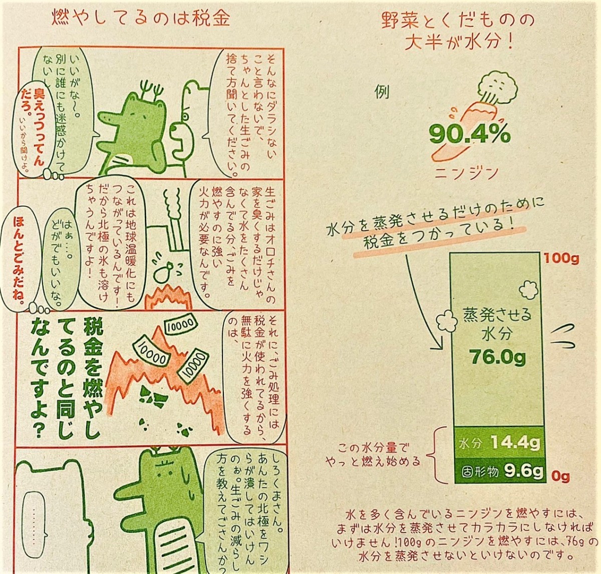 水分の多い生ごみの焼却には強い火力とお金がかかり、地球温暖化に繋がるCO₂も大量に発生します。