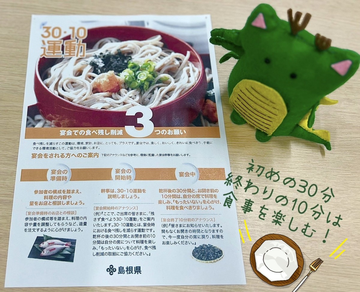 島根県では、宴会の開始30分と終わりの10分は自席に座り、料理をしっかり食べる「3010運動」を推奨しています。