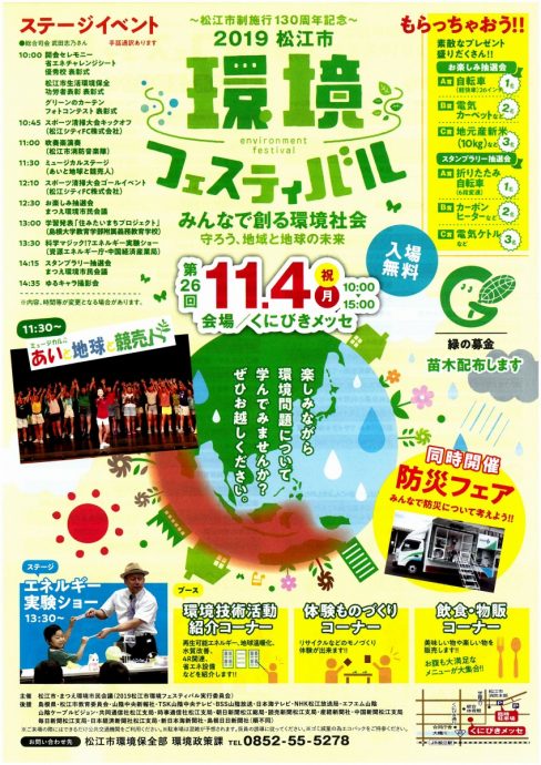 HOME > おしらせ > 11/4(祝月)松江市環境フェスティバルに出店します 11/4(祝月)松江市環境フェスティバルに出店します 2019.10.24 11/4(祝月)『松江市環境フェスティバル』に出店します٩꒰。•◡•。꒱۶ エコサポしまねのブースでは ★うちエコ診断 ★マイバッグ作り をする予定です! この機会にお家のエネルギーの消費状況や 平均的な家庭と比べてどうなのか把握ください♪ 気になる箇所があれば診断士がご相談にのります! 人気のマイバッグ作りでは、好きな絵を描いて 世界に一つのバッグを作ろう♪ 買い物や、靴入れなど沢山使えてオススメです ぜひお立寄りください★ « しまエコVol.16発行★ 予約受付中!11/8(金)『高齢者の健康と住まいの省エネ』セミナー »