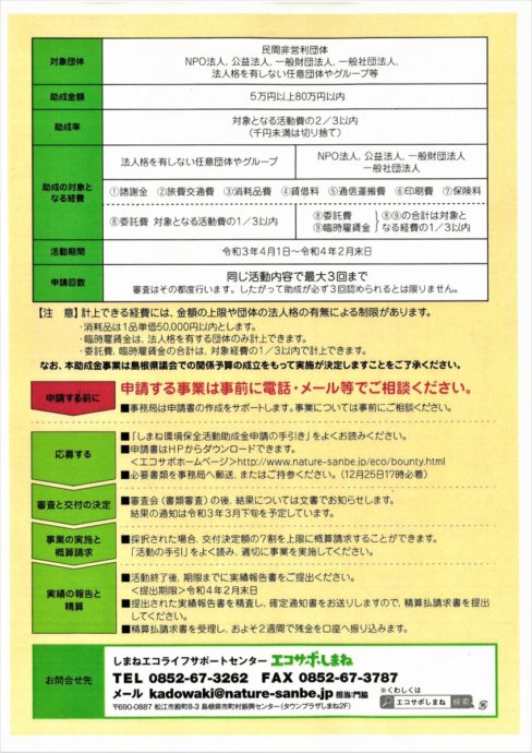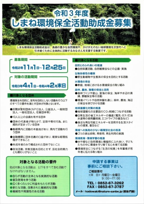令和3年度しまね環境保全活動助成金の募集を行っています。
