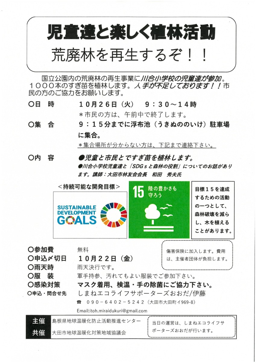 大田市川合小学校の児童たちと一緒に1000本のすぎ苗を植林します。