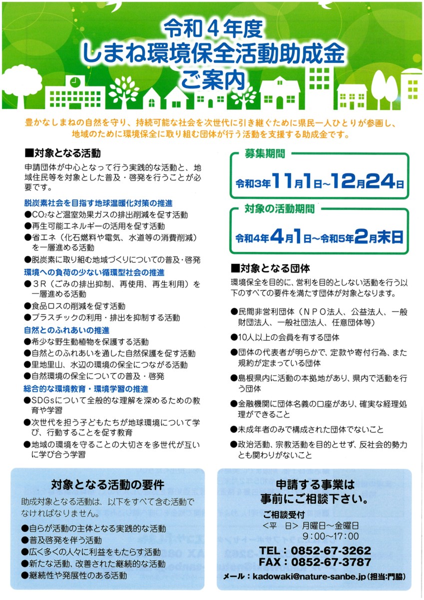 令和4年度しまね環境保全活動助成金の募集(11/1~12/24)