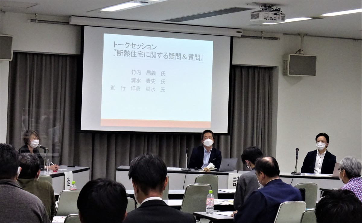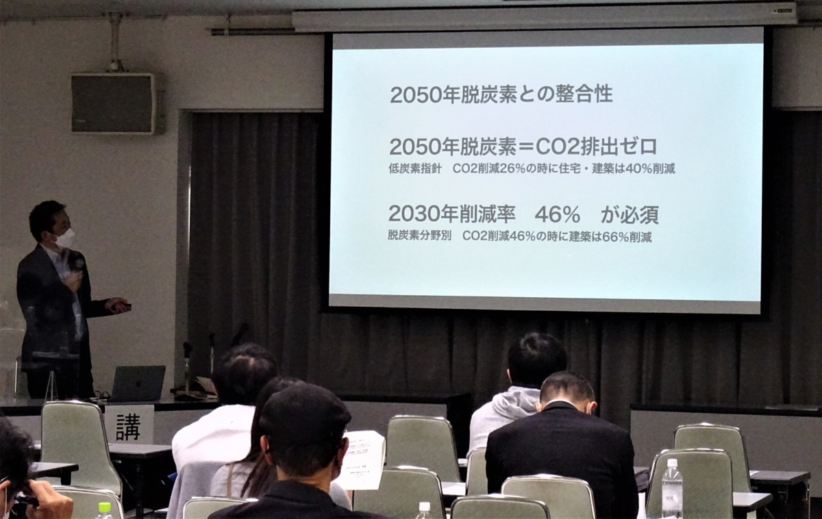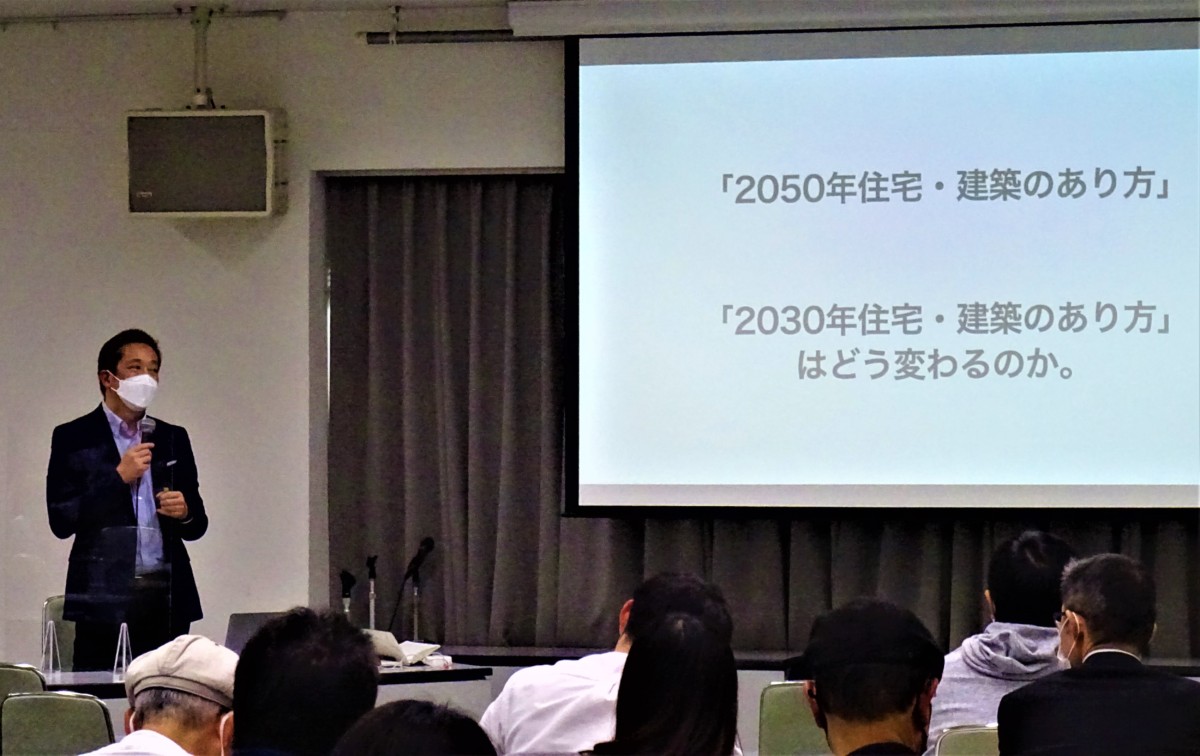 竹内先生には「2050年住宅・建築のあり方」をテーマに、長野県が行う「長野県ゼロカーボン戦略」や、鳥取県の「とっとり健康省エネ住宅(NE-ST)」への助成制度、山形市の「ほぼゼロエネルギーハウス」の実例紹介等と共に断熱建材の活用や太陽光発電の導入で得られる効果についてお話いただきました。