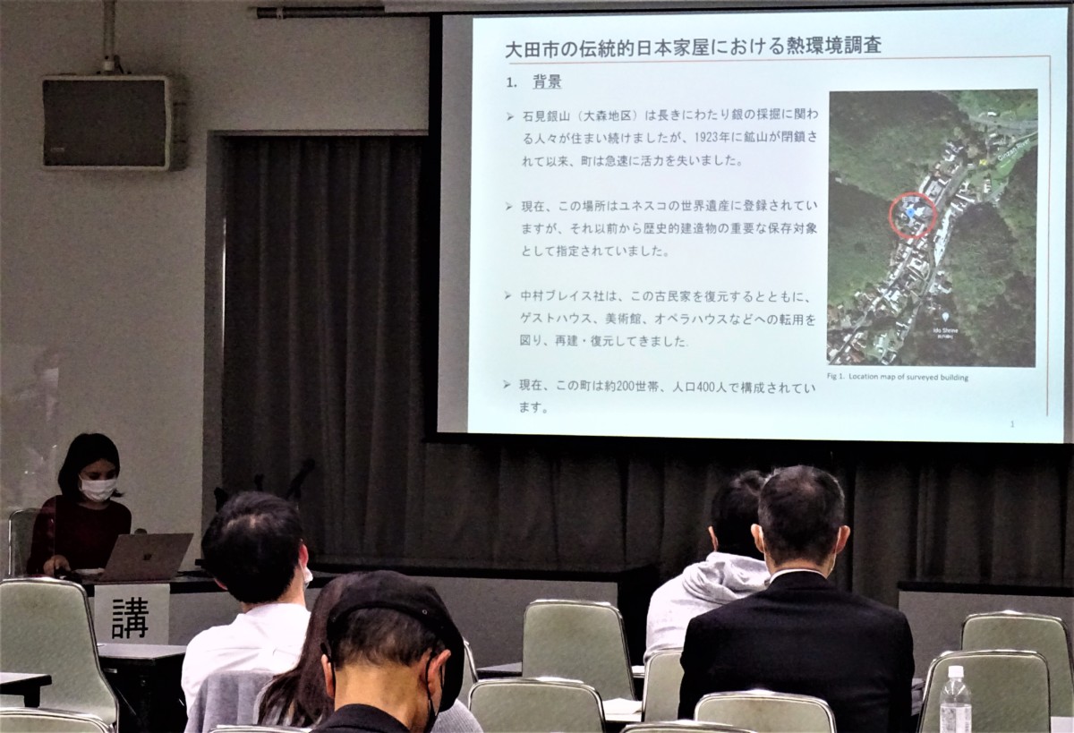 また、室温以外に「快適な住まい」に関わる湿度・気流・壁の温度・服装・運動量などの「温熱感」について島根大学の清水先生より紹介があり、研究室で学ばれているShresthaさんが大田市の伝統的日本家屋で行った熱環境調査の結果を発表されました。