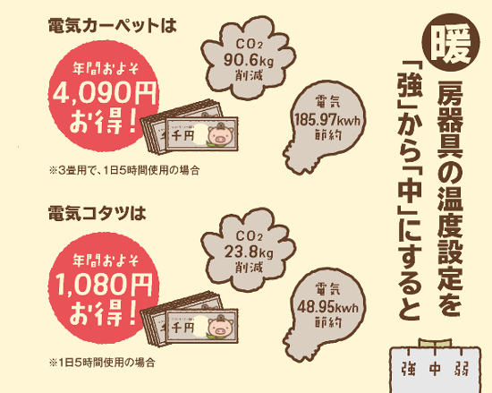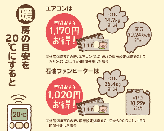 エアコンやファンヒーターの設定温度を少し下げるだけでも、エネルギーを使う量はかなり少なくなります。