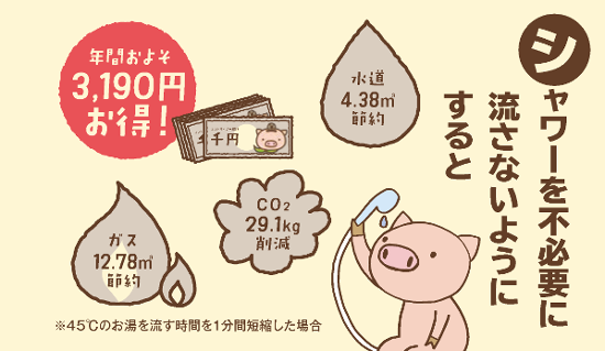 頭やカラダを洗っている間に、シャワーを出しっぱなしにしていませんか?家族全員が1分間シャワーの時間を短くするだけでもかなりの省エネ効果が!