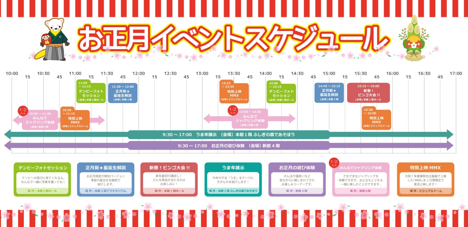 干支の午年にちなんだ展示や、お正月版プラネタリウム生解説、昔ながらのあそびなどで正月を楽しむ2日間。