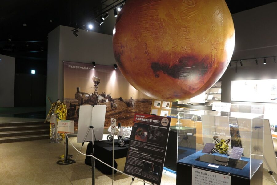 火星由来のいん石やはやぶさ2が持ち帰ったサンプルの実物をはじめ、ロケットや探査機の模型と映像、宇宙服などを展示します。