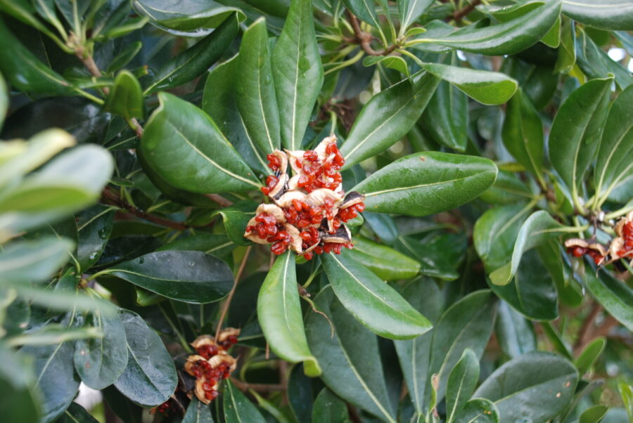 もうひとつゆかりのある植物に、トベラがあります。海岸沿いに生える常緑樹で、冬に赤い実をつけます。葉や茎は独特の匂いがあり、葉を燃やすとバチバチと大きな音を立てます。このような特徴を厄除けに込めて、節分飾りに使う地域があるそうです。