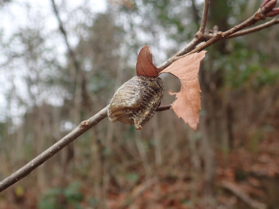 枝先に付いているのはハラビロカマキリの卵のうです。中には最大数百もの卵がつまっています。カマキリは種類によって卵のうの形が決まっていて、本種は他種に比べ色が濃く表面が滑らかでツヤがあるのが特徴です。また草よりも木の枝によく産み付けられます。