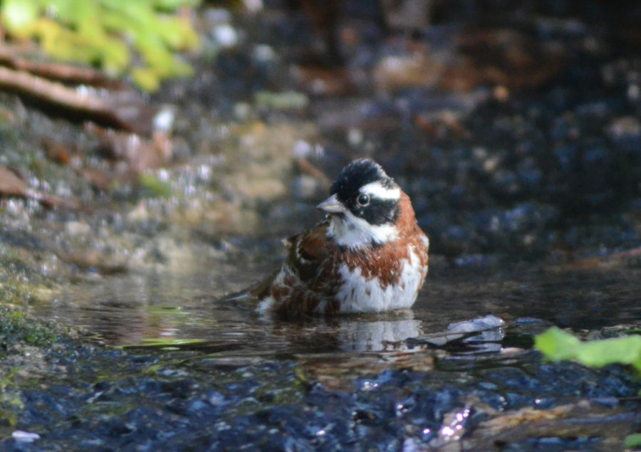 雪が消えはじめると、水場の周りの斜面で落ち葉をめくる鳥がいます。ツグミです。ツグミは地上でエサをさがすため、積雪の少ない場所を選んでやってきます。そして、水場には水を飲みにくることが多い種類です。ツグミは色や模様に個体差が大きいのも特徴です。とくに渡りのシーズンである3~4月は、冬羽から夏羽への移行途中のさまざまなパターンの個体や亜種ハチジョウツグミ、それぞれの中間型などにも出会えるツグミウォッチングが楽しい季節です。
