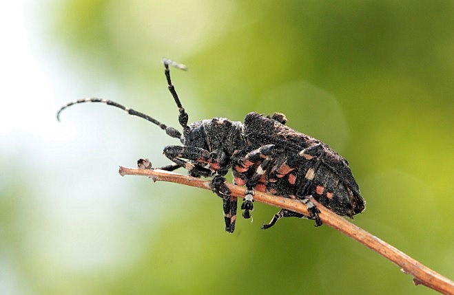 お腹の赤い模様と背中にあるコブ状の突起から名付けられたカミキリムシで、春先から三瓶で見られます。幼虫はクヌギなどの朽ち木を食べますが、シイタケ用の原木も食害するため、害虫としても知られています。