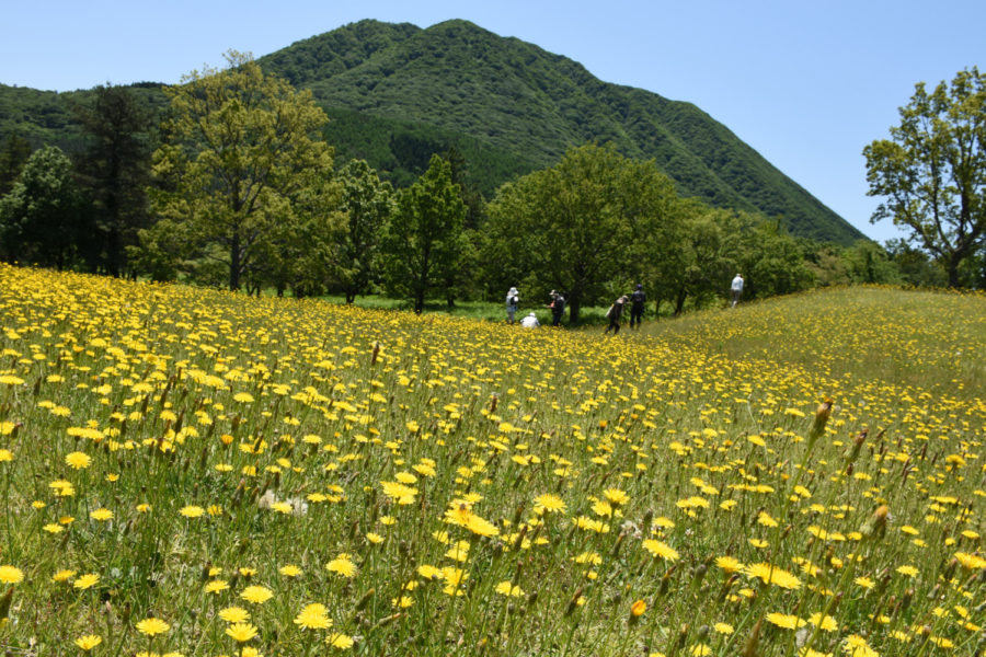 5月の三瓶山麓では、一面に黄色い花が広がる風景を目にすることがあります。タンポポに似た花の正体はブタナ。ヨーロッパ原産の外来植物です。フランスで「豚のサラダ」との名があり、それがもとになってブタナの名がついたそうです。きれいな花なのですが、繁殖力が強く、三瓶では広がりすぎで少々困った存在になっています。