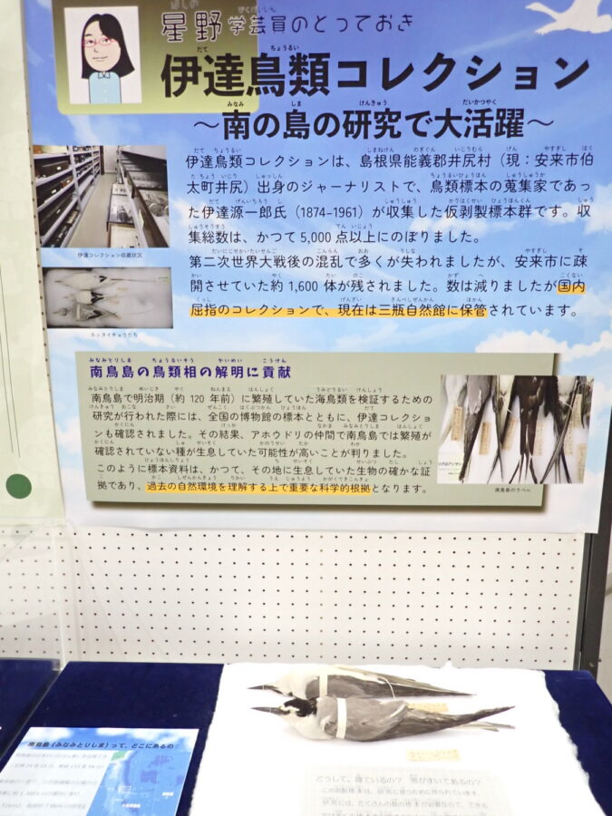 昨年の冬から、当館では収蔵庫に保存している様々な標本を紹介するミニ展示を本館ホールの一角ではじめました。今年の9月からの2ヶ月間は、鳥類の展示期間。標本の重要性を一番伝えられるのは・・・と考え、研究用の標本ではありますが、戦前に収集された「伊達鳥類コレクション」の一部を展示することにしました。これらの標本の中には、現在ではその場所で観察することができない種類もあります。例えば、日本列島から遠く離れた日本で一番東にある『南鳥島』。ここには明治時代にはアジサシの仲間の集団繁殖地(コロニー)がありましたが、さまざまな理由で消滅してしまいました。そして、現在でもそれらの繁殖地は復活することはなく、その鳥たちも日本で見ることはごく稀です。そんな鳥たちが生存していた証拠となるのが標本。貴重な標本なので劣化を防ぐために2週間ごとに標本の種類を入れ替えています。今の展示標本は、マミジロアジサシ。この標本は、10月31日までの展示となっていますので、興味がある方は、ぜひご来館ください。