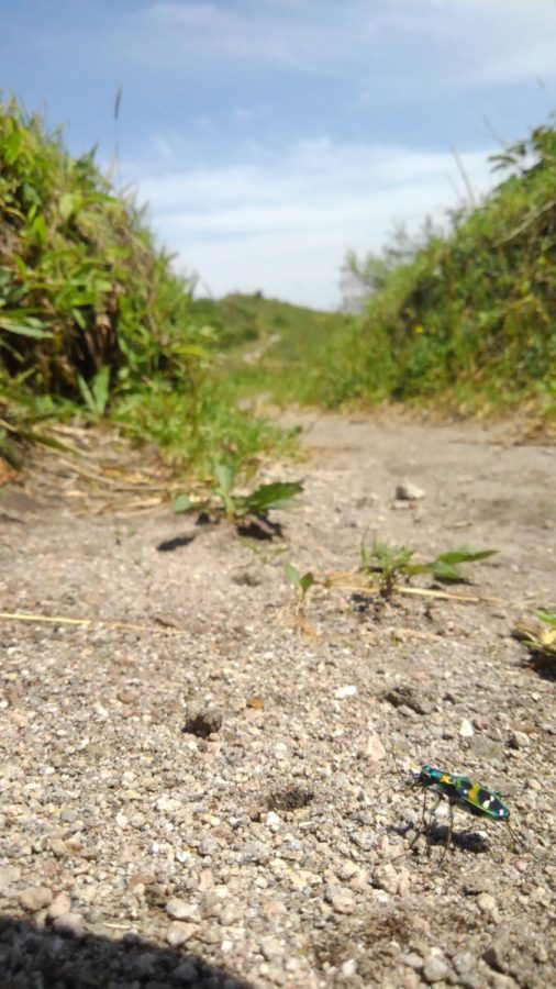 ここは標高1,126mの男三瓶山頂です。次々に登山者が訪れる頂上でナミハンミョウを見つけました。登山途中の林内では見かけませんが、山頂付近の日当たりのより開けた場所までたどり着くと、地表を素早く歩行するハンミョウが見られます。しかし、多くの登山者は足元で活動するハンミョウの姿には気づいていないようです。