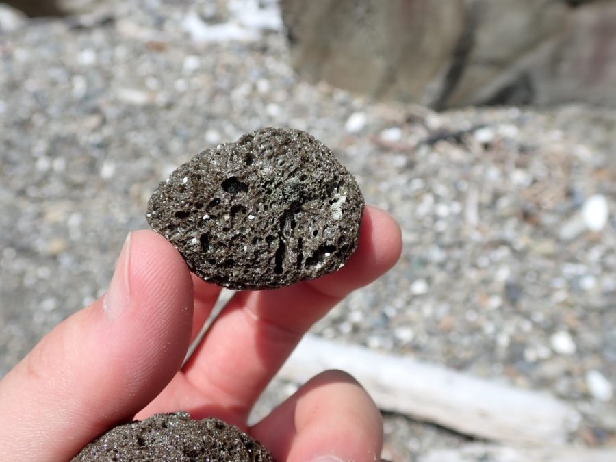 今年の秋くらいからでしょうか、砂浜を歩いていると、黒い軽石がポツポツと落ちているのを見かけます。これは昨年10~11月頃、小笠原諸島の硫黄島沖で噴出した軽石です。この硫黄島起源の軽石は、2024年5月には四国や関東の太平洋岸で漂着が確認されており、日本海側には少し遅れてやって来たようです。