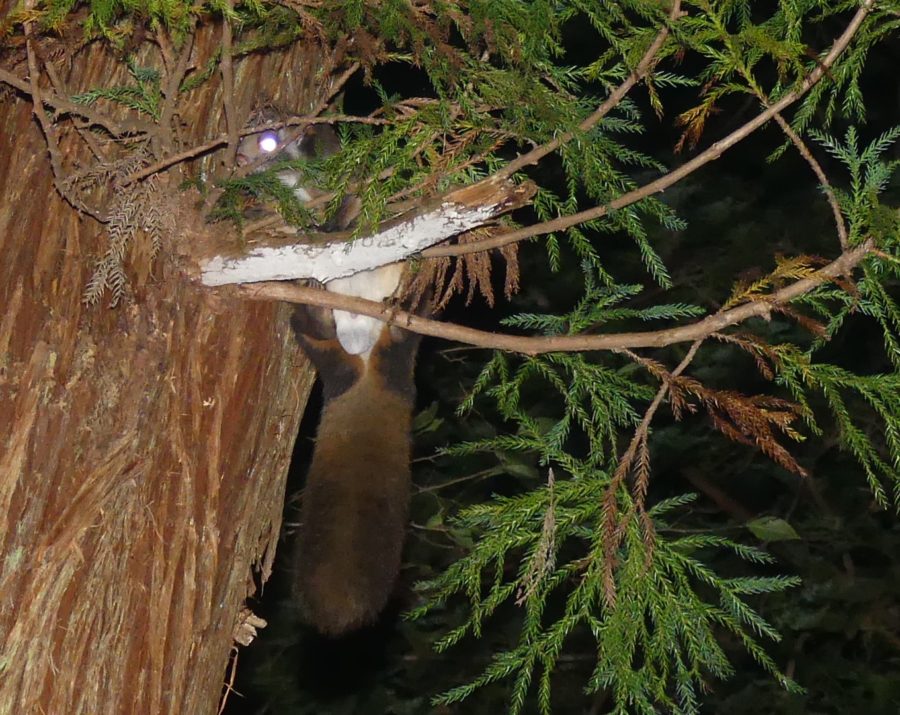 夜の森のは賑やかなもので、ガサガサ、ゴソゴソ、ブホッと音を立てて、イノシシが地面を掘ってエサとなる植物の根茎やミミズなどを探しています。木の上からもグルルルルっと何やら怪しげな鳴き声が響いてきます。懐中電灯で照らすとムササビがいて、幹を上の方に登り、木から木へと滑空して行く姿も見かけます。