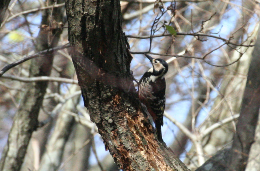 三瓶の晩秋は落葉した樹林になります。花も紅葉も見られなくなる頃は、森に住む野鳥を見つけやすい季節。11月下旬のある日。木の幹に動くものを見つけてレンズを向けると、オオアカゲラの姿を発見。暖かい服装で、ゆっくり自然林を歩くと、それまで見られなかった野鳥を見つけることができるかもしれません。
